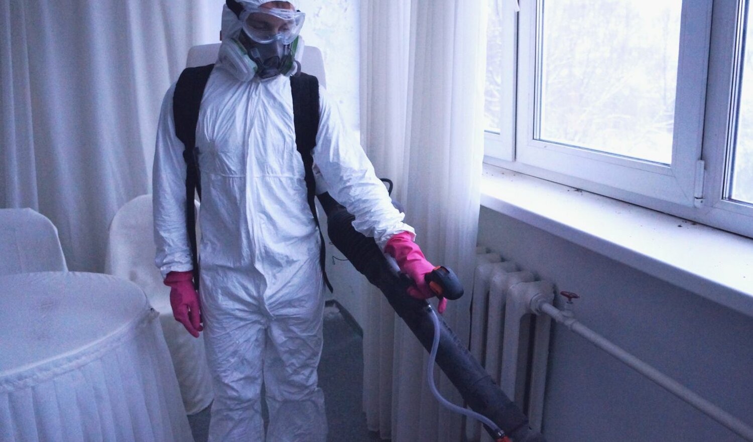 специалист проводит дезинсекцию подоконника, где стояли растения